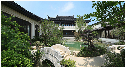 一般來說,大型的中式庭院是由建筑、山水、花木共同組成的一件藝術(shù)品,建筑以木質(zhì)的亭、臺、廊為主,月洞門、花格窗起到阻隔、分割視線的作用。而庭院植物也有著明確的寓意和嚴格的位置,如屋后栽竹,廳前植桂,花壇種牡丹,水池栽荷花等。